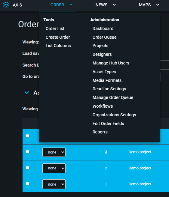 The Order module is an order management system that allows users to request an asset from another team member within the organization. Custom orders can be quickly created and submitted for assets to be worked on an uploaded into Axis.