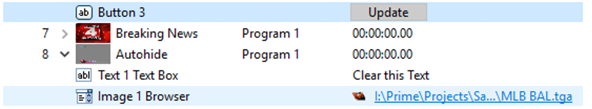 Expanding the item by clicking on the Right error next to the ID will expand the item to show any Control Panel items for this Scene. From this view, you can trigger buttons or do text, image and clip overrides.