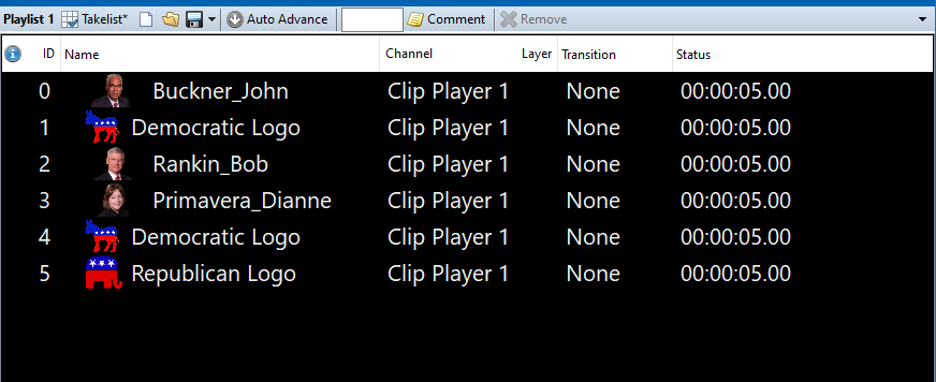 Allows scenes, messages, clips and images to be arranged in order to be played out manually. Each item is Loaded, Played, and Cleared using Enter or Spacebar keys. Items can be cleared using Escape key. The Takelist also includes an Auto Advance option that causes the next item to be automatically loaded and selected when the current item is played. Items can be selected by ID number using the Numpad + Enter.