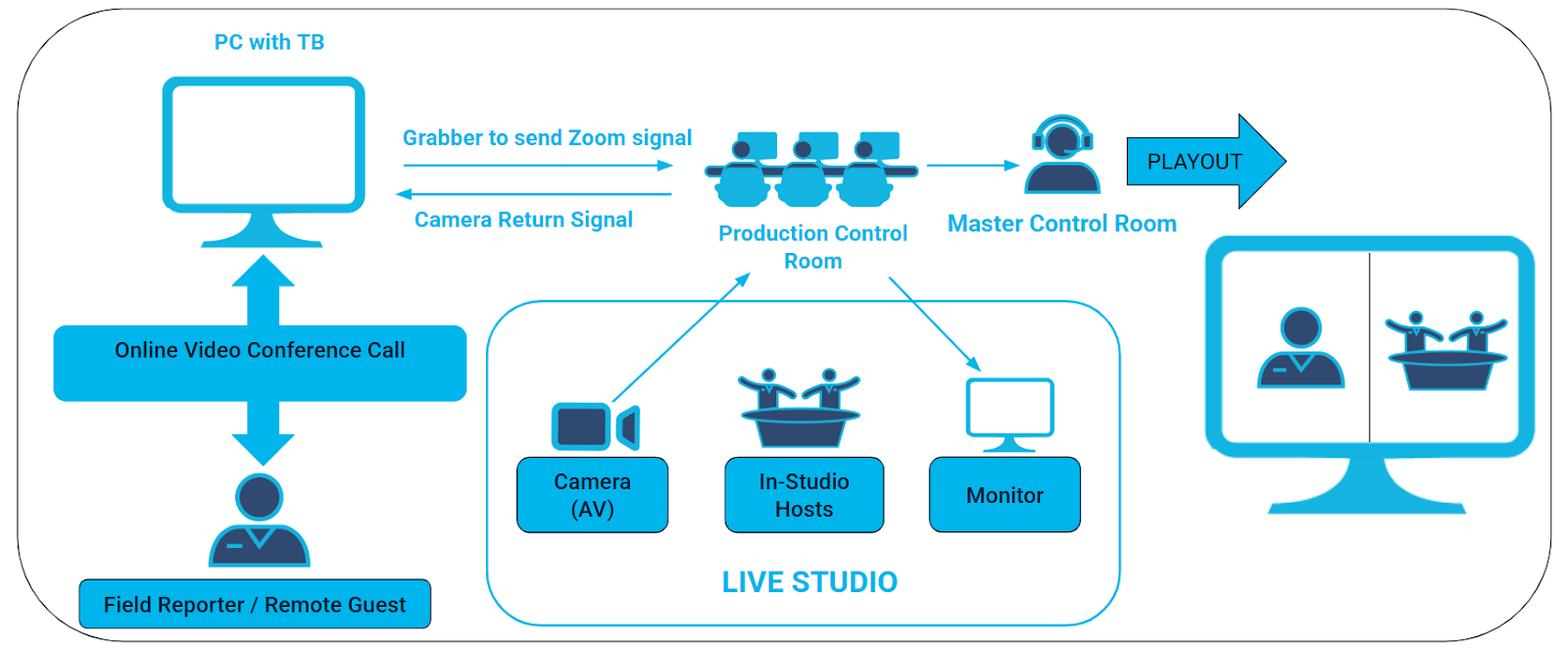 Via the Grabber or VLC player the Toolbox can send an audiovisual signal to your selected output. But what if you want to grab a video call while the Journalist is not in front of the computer but already in the studio? The Camera Return Signal functionality allows to ingest the signal from the studio and use it as camera signal on your video conference:
