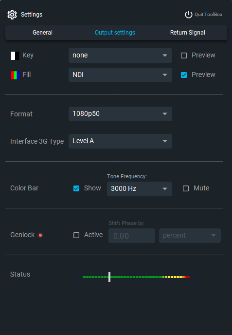 - Color Bar: "Show" enables color bar in output if no session is active. Otherwise output will be black. Tone frequency can be muted or changed