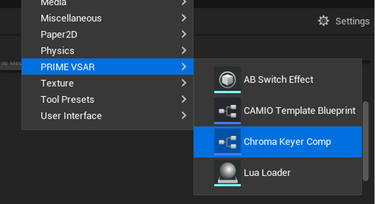 In the Content Browser, right-click to show the contextual menu, go to “PRIME VSAR” category and select “Chroma Keyer Comp”.