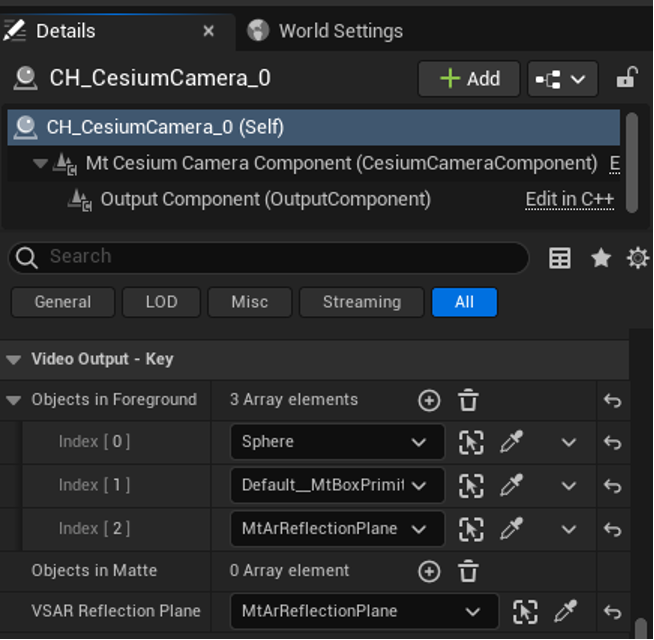 Setting for Matte plane can be changed in when clicking on cesium camera in the Matte plane section or in the VSAR Config → Cameras section