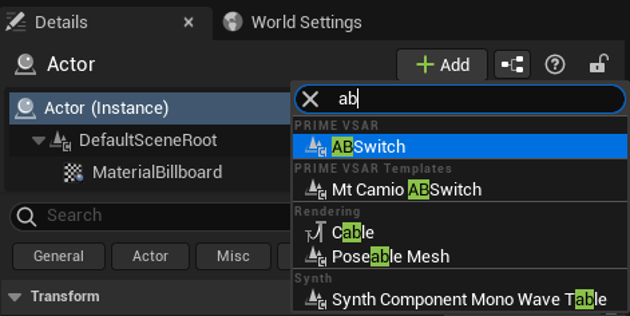 - Add the AB Switch component to the actor of your choice by using the Add Component button.