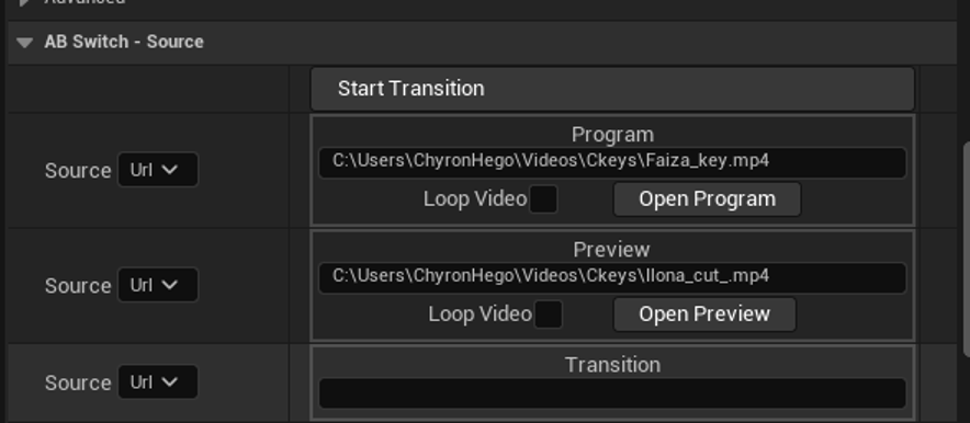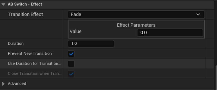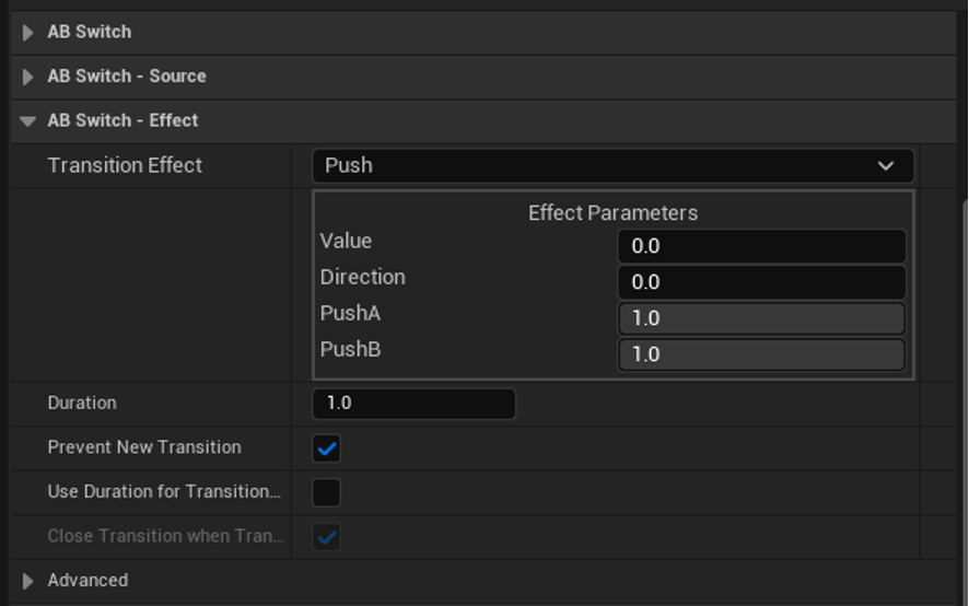 Value Parameter is used by the AB Switch to drive the transition, When using Use Transition Player, Transition Texture Parameter is used instead (of Value Parameter) to drive transition.