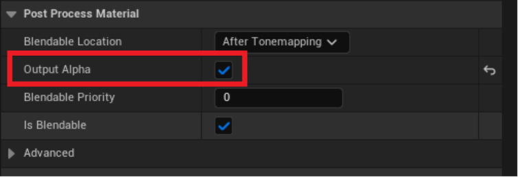 Material used for AB Switch Effect is expected to be post process domain, the blend mode to be alpha composite (this can be set after Output Alpha is enabled), the shading Model to be Unlit and Output Alpha enabled: