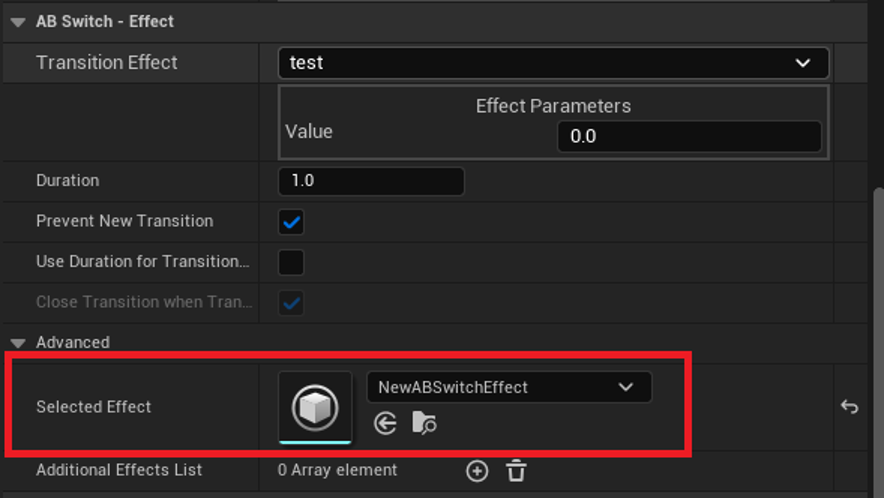 Effects are Material based Structure. so we will need two thing to create custom one, Material and the AB Switch Effect Structure that can be added through the content browser Add/Import → PRIME VSAR → AB Switch effect: