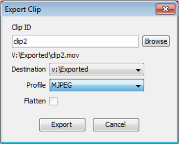 Exported clips dialog can be invoked from the exported clips button or from JLCooper Jog/Shuttle controller by pressing button W4 (default function). The dialog allows simple clip administration (remove, rename).