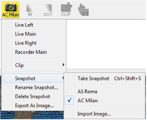 Snapshot menu item shows previously taken snapshots. It contains only those, which have been taken using the same Video Format, that is used for current session.