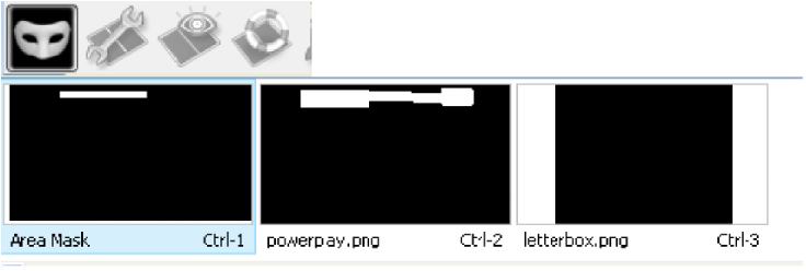 When the mask is more complicated you can prepare your own image masks in advance. First prepare the mask. Create a gray-scale image with the same resolution as set in your system. The black pixels makes normal graphics insertion and those that are tracked. The white pixels makes the graphics invisible and are ignored by the tracker. You can use Black/White gradient to control the opacity of graphics insertion. Save the mask into a PNG file and copy into your project directory. The mask image can look like this: