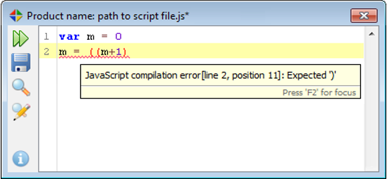 Script editor performs syntax validation. Syntax errors are displayed in tooltip when you place mouse over the red underlined text.