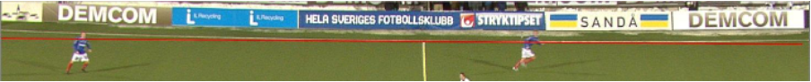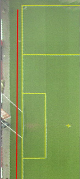 The calibration line should be as close as possible to the real pitch line. The length of the calibration line does not necessarily be the same as the real line. Because of camera lens distortion and pitch curvature the lines in video are not straight. It is therefore sometimes impossible to draw the calibration line to exactly match the pitch line. In this case try to draw the line shorter in the middle, most straight segment of the real line. See following examples: