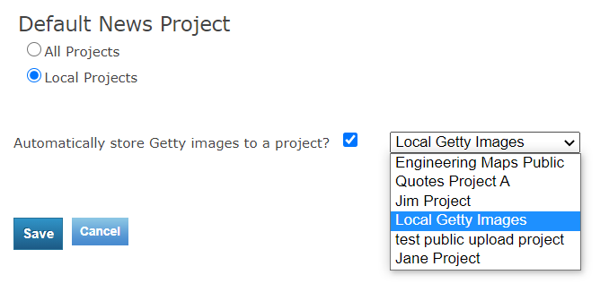 - From the dropdown, select the Project (folder) from the dropdown to which the Getty images are to be saved. The available Projects are those that have been specified as Public in Projects administration (Home > Admininstation > Projects).
