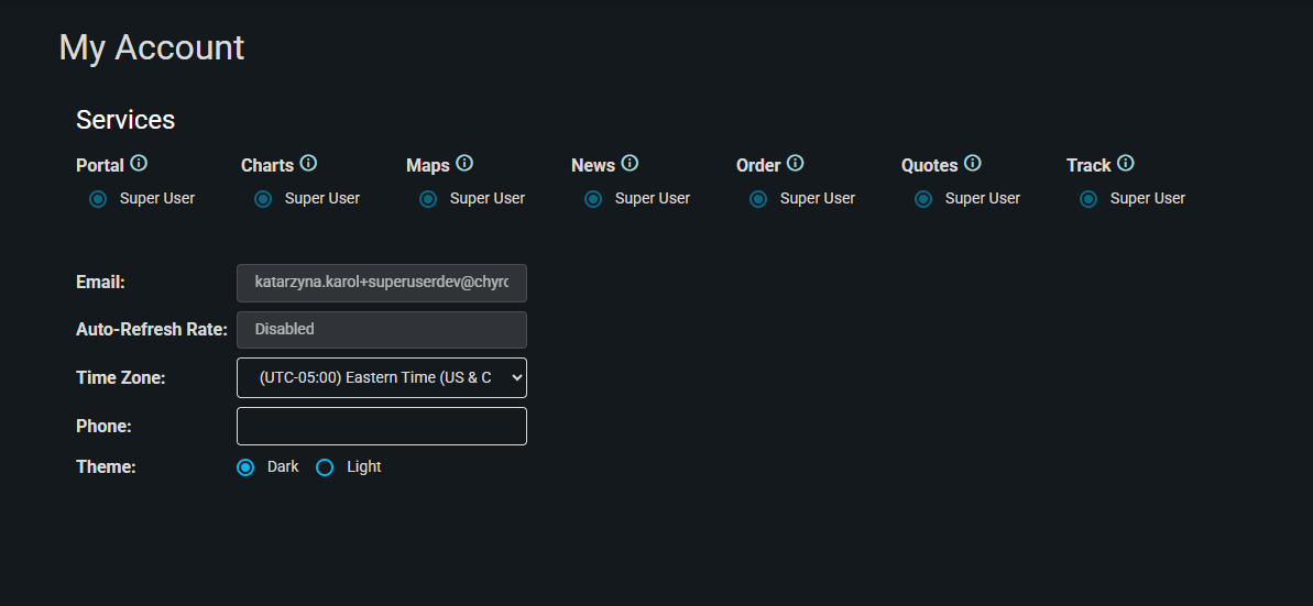 - Role selection options for each service (e.g., None, User, Super User, Limited User) are no longer displayed on the My Account page.