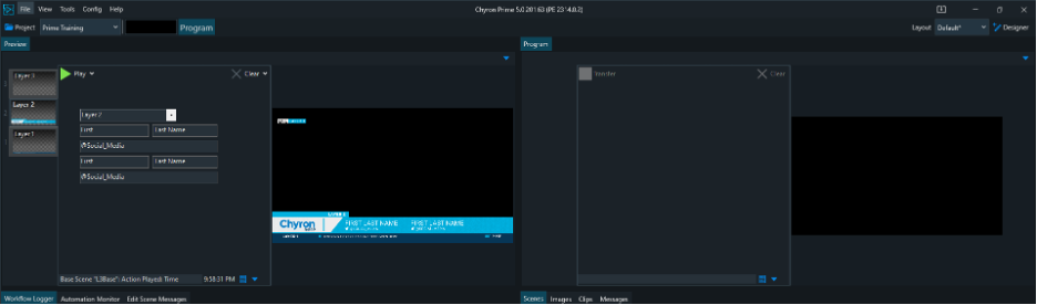 Multiple scenes can be played to air simultaneously. Scenes can be fully previewed in the preview channel. No matter what the state is of the scene in the preview channel the scene will revert to the “Default” state when played to air. In the example below two scenes are loaded into preview. One scene is in layer 5 and the other scene is in layer 1.