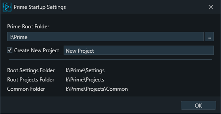 - Prime Root Folder - User defined Root Folder location in which Prime will save and attempt to open all New and Existing Projects from