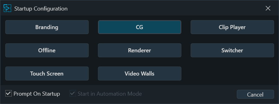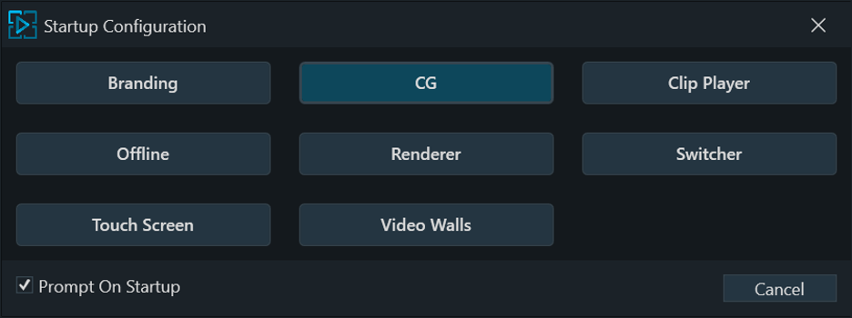 - Prompt On Startup: Enables the setting to prompt for a Playout Configuration, displaying the Startup Configuration screen each time PRIME starts. This can be toggled by navigating to Prime Playout Configuration -> Config -> Settings -> General.