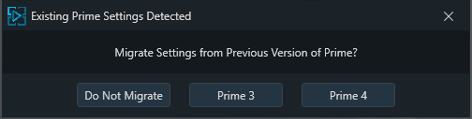 PRIME 5.0 has a new default settings folder location. Due to this, If previous Prime 3 or 4 settings are detected, Prime will ask if the user would like to migrate those settings.