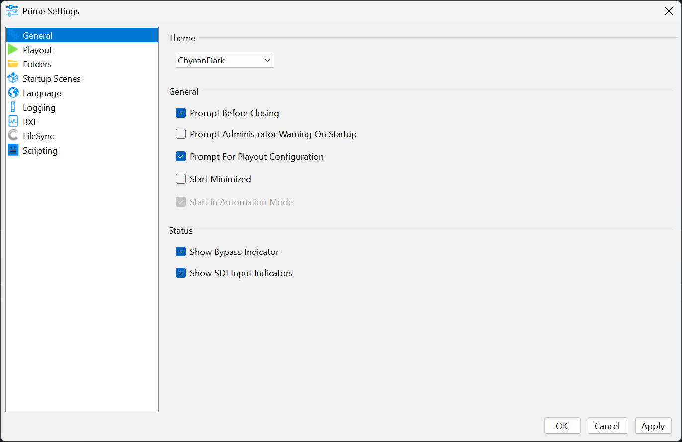 - Start in Automation Mode: Starts Prime in a minimal 'Playout Only' state, designed to be operated solely by an Automation System. This setting is enabled/disabled via Prime Playout Configuration -> Config -> Settings -> General.