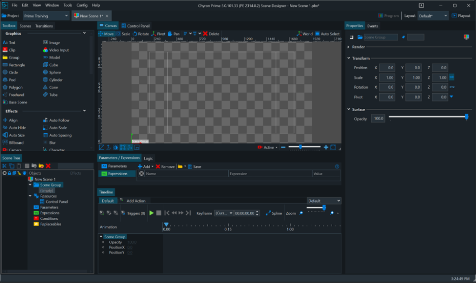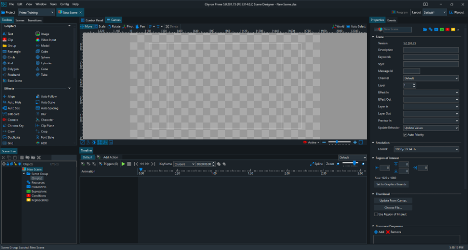 Scene Designer is the primary design application designers will use to create 2D and 3D graphics available in Prime Playout Mode.