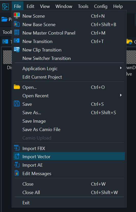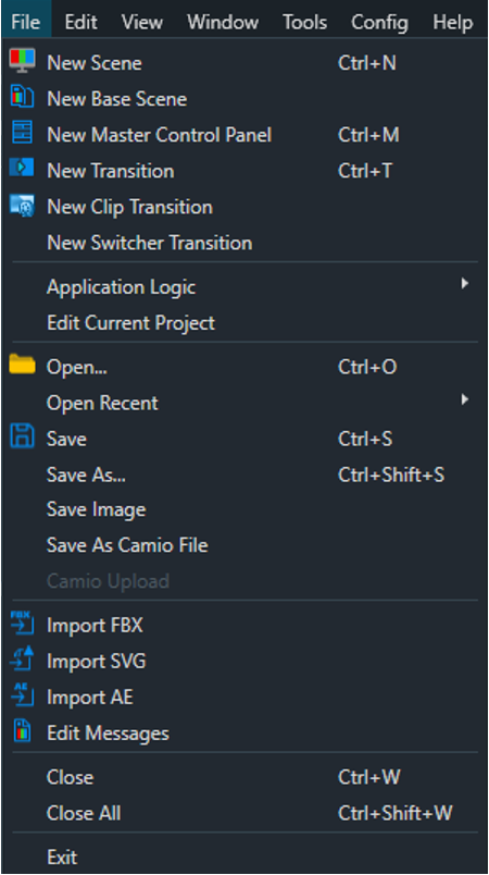 New Scene: Create a new scene (.pbx). Useful to have a base scene and its elements when new scenes are created. New Base Scene: Create a new base scene (.pbs) to be referenced by normal (.pbx) scenes. New Master Control Panel: Create a new Master Control Panel (.mcp) New Transition: Create a new transition (.pbt) New Clip Transition Create a New Clip Transition (.pct) New Switcher Transition: Create a New Switcher Transition (.pst) Application Logic: Create and Edit Application Logic (.pal) See the separate “Application Logic” Section for more details. Edit Current Project: Edits the current project in the scene editor. This allows for custom resource objects to be loaded when the project is selected. Open: Open a File Open Recent: Open a Recently Opened File Save: Save the File Save As: Save the File as a different file name Save Image: Captures an image of the current state of the canvas Save as CAMIO File .CRD files are currently generated when ‘Saving to CAMIO’ from the Prime Designer. This process automatically exports the file into the Chyron CAMIO Context and Folder defined by the CAMIO export settings in Prime.