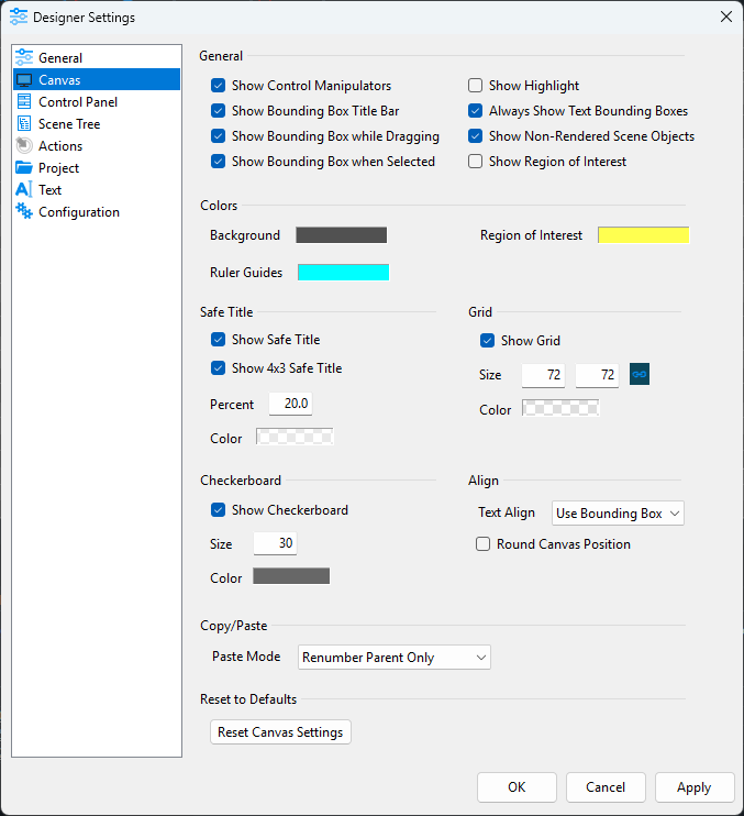 The Prime Scene Designer Canvas derives the starting resolution from the first output channel within Prime Playout Configuration. Any Custom resolutions set in the Playout Configuration will be enumerated in the Canvas Resolutions list automatically and vice versa.