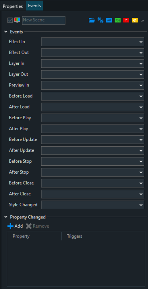 Before Load: Executes once before a scene is loaded into either Preview or Program Effect In: Triggers when a scene is transferred to Program. (See Layer In) Effect Out: Triggers when a scene is transferred from Program to Preview or Scene is closed. (See Layer Out) Layer In: Triggers when a scene in Preview plays to Program replacing another scene in the same layer. This supersedes the “Effect In”. Layer Out: Triggers when a scene in Program is played off by an incoming scene in the same layer. This supersedes the “Effect Out”. Preview In: Triggers when a scene is loaded into Preview. Supersedes the Effect In for Preview. Before Load: Triggers before a scene is loaded into Program After Load: Triggers once after a scene is loaded into either Preview or Program Before Play: Triggers before a scene is played from Preview to Program After Play: Triggers after a scene is played to output Before Update: Triggers before the elements of a scene are loaded. After Update: Triggers after the elements of a scene are loaded. Before Stop: Triggers when a scene is taken off Program After Stop: Triggers after a scene is taken off Program Before Close: Triggers before a scene is closed. (Cleared from both Preview and Program) After Close: Triggers after a scene is closed. (Cleared from both Preview and Program) Style Changed: Triggers when the scene’s Style Property is changed (See Style Property) |