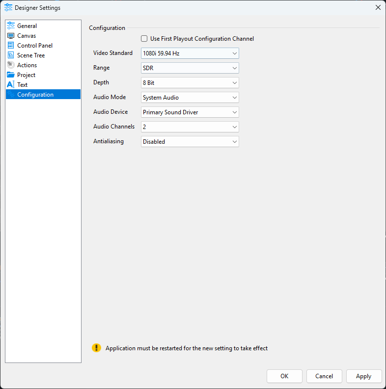 Uses the very first PRIME Playout Configuration Channel Settings to configure the PRIME Scene Designer Canvas output settings (Traditional Method from all Previous PRIME Versions).