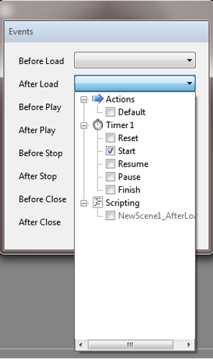 All of the scene events handlers can be used to attach any of the other objects methods in the scene. EX:Timer1.Start