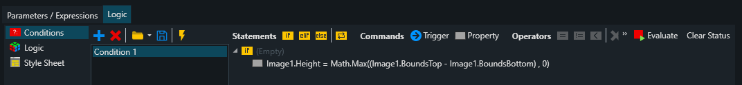 Note that the “Condition” property will always show you what the actual condition is that will be evaluated. The condition property will only be enabled when “Hide on Condition” is selected allowing the user to manually create a condition.