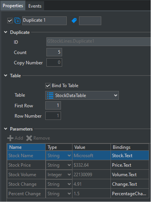 Notice the “Bindings” column. This is where you can drag and drop other object properties to bind the data. All Object properties are bindable like Color, opacity, Position etc.