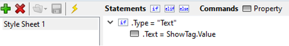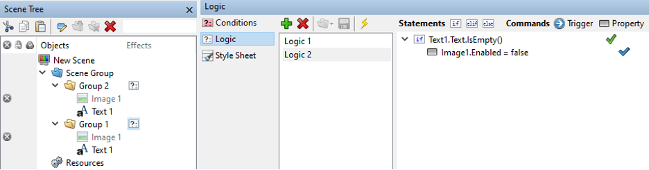 In the first example the Image object will hide if Text 1 is empty and in the second example the Image object will hide if Text 1 is NOT empty: