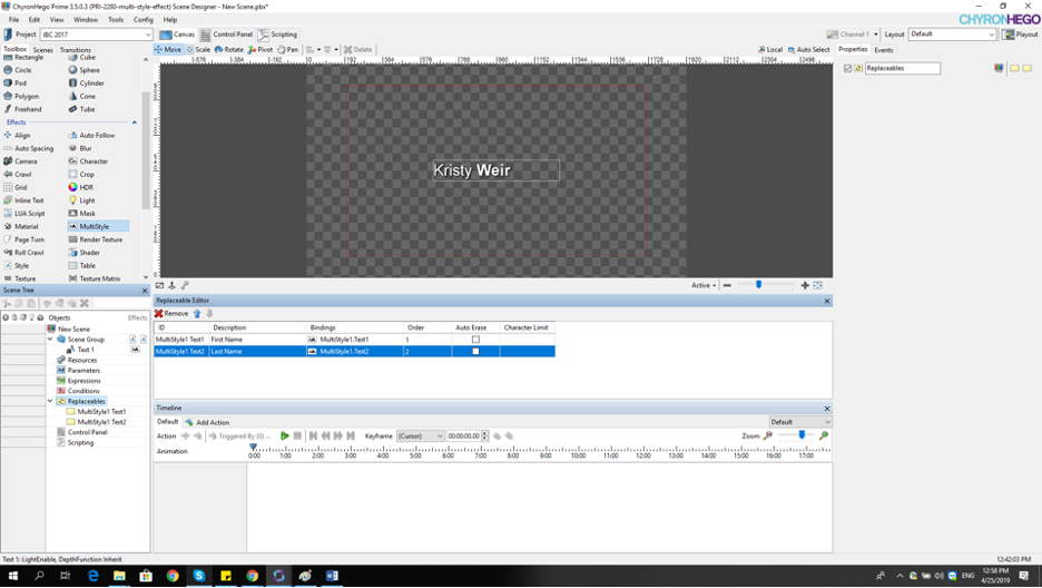 The “Character Effect” allows animations to happen one character, one word or one line at a time. A character affect may be applied to a Text object only.