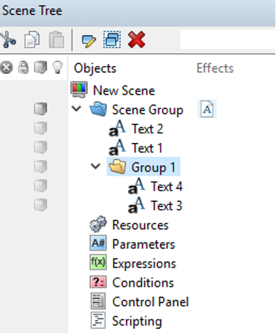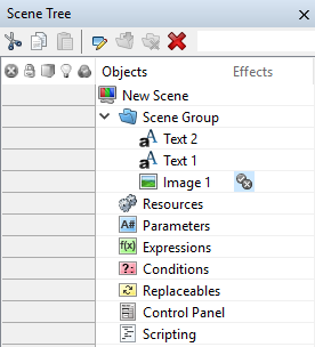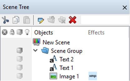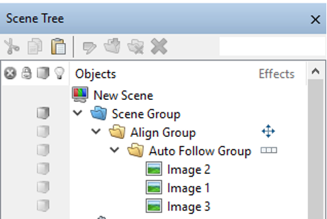 This Effect is intended to be used in conjunction with AutoFollow Source Mode. A Virtual Group effect can be applied to multiple objects in a scene, regardless of how they have been physically grouped together in the scene tree, to “virtually” group them together. The benefit of this is the effect will give the calculated values for the Left, Top, Right and Bottom of all objects within the virtual group.