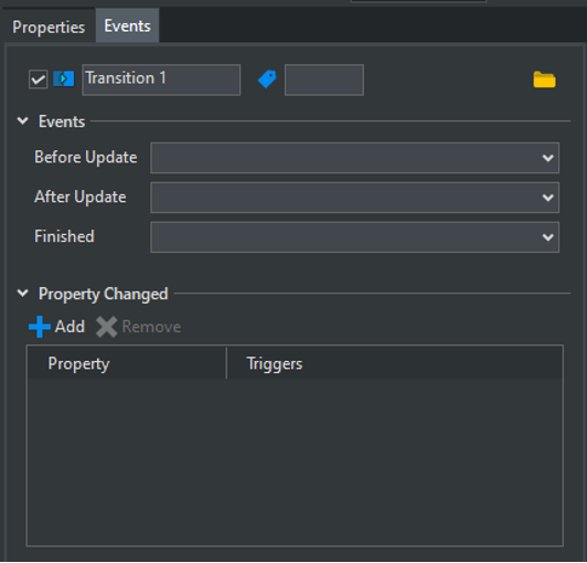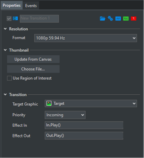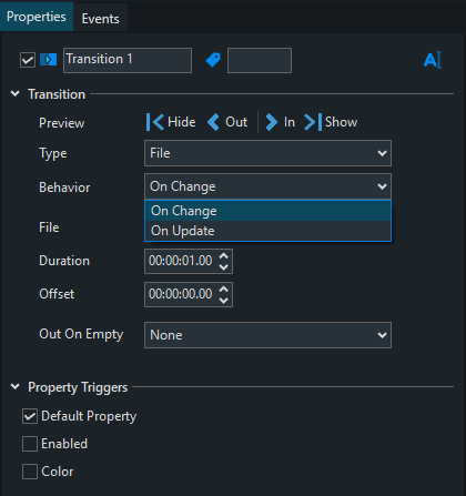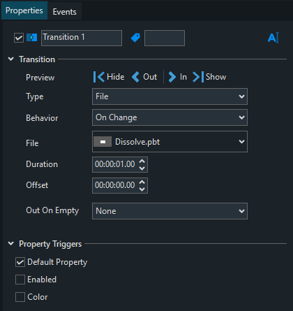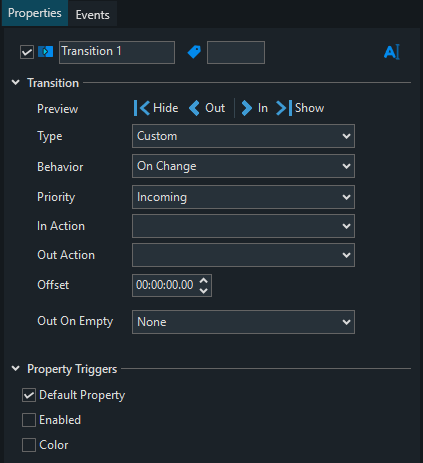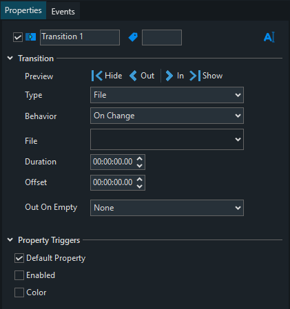 - Default Property - If checked, the transition will be triggered when any child graphic default property changes (ie, Text property for a Text object, File property for Image or Clip objects…)