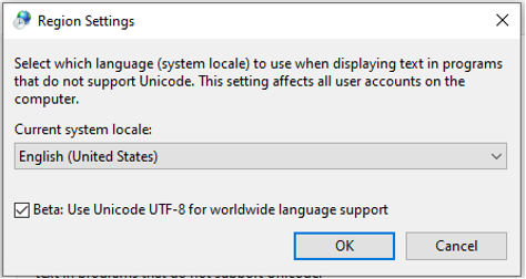 To enable this setting, go to Windows Settings > Time & language > Language & region > Administrative language settings > Change system locale…, and check Beta: Use Unicode UTF-8 for worldwide language support. Reboot the PC for the change to take effect.