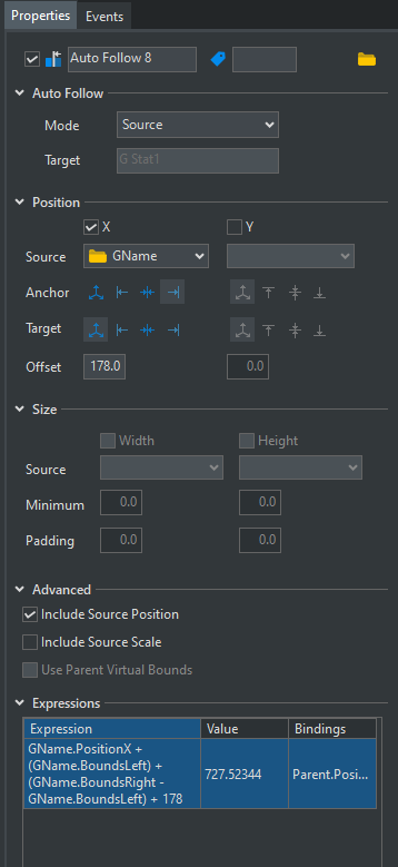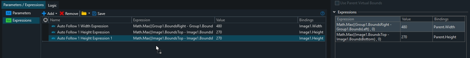 - Parent: Left, Top, Right and Bottom values of the object the virtual group is applied to. Width and Height of the object the virtual group is applied to.