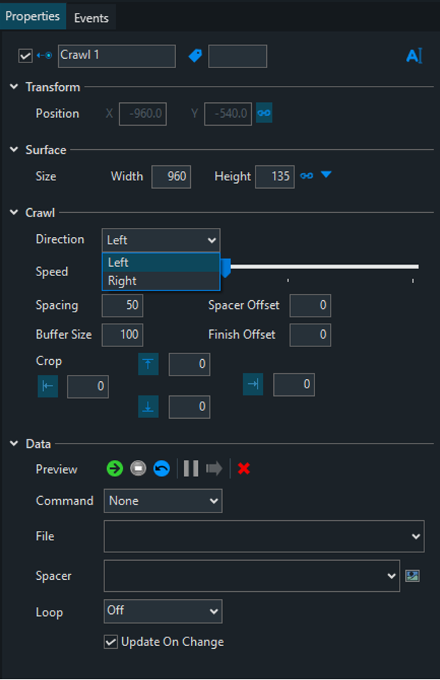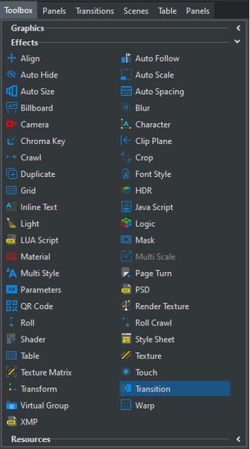 Transition effects can be used to animate graphics from one value to another. By default, the transition will occur when any child graphic default property changes (such as the Text property of a Text object, or the File property of an Image or Clip object), but can also be configured to trigger when child graphics are Enabled or Disabled, or when their Color changes.