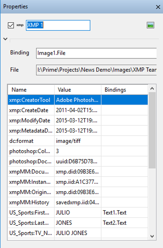 Adobe's Extensible Metadata Platform (XMP) is a file labeling technology that lets you embed metadata into files themselves during the content creation process. PRIME can bind to the data stored in Image files.