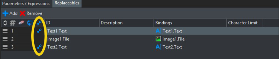 In the Replacables window there is a databound column with a chain link icon. Click in the empty row space of the replaceable column to turn on the databound icon for each object that is databound to XMP.