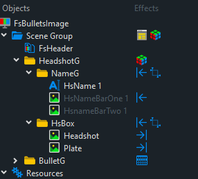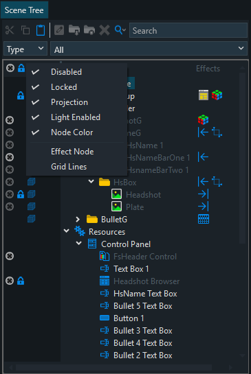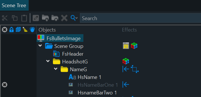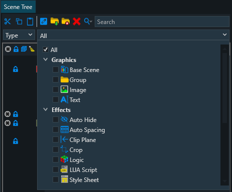 Designers can search for and see all added Objects in a Scene. By selecting one or more objects at a time, designers can quickly search for certain objects such as Graphics, or Graphics + Effects, or Graphics + Effects + Resources for example.