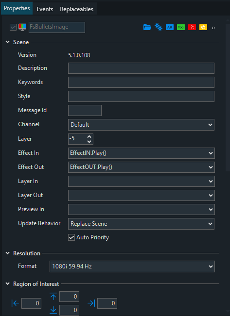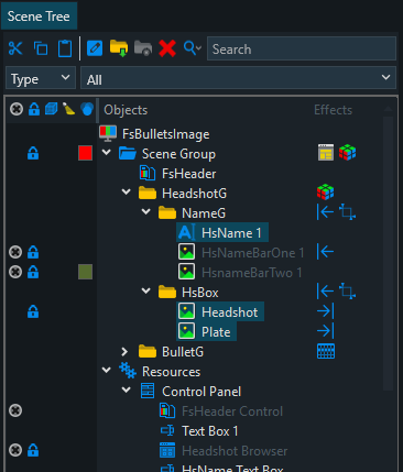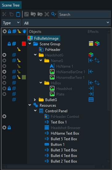Shows all added Scene Toolbox Objects (Graphics, Effects, and Resources), Control Panel Controls, Parameters, Expressions, Logic, Conditions, and Replaceable objects from top to bottom.