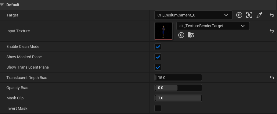 Clean Mode allows to capture the Talent's video feed cleanly, without applying any texture filters or tonemapping. Clean Mode only works with Masked materials, as it uses Custom Depth Stencil.